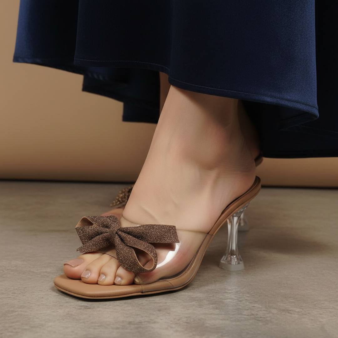 Add a hint of opulence to your evening attire with these transparent square-toe heels. Valuing individuality, every pair is highly coveted among the fashion-forward crowd, , Â statement silver bow is featured on the top with rhinestone embellishment. These heels are sure to turn heads wherever you go, Style them with a stunning evening gown for a high-end look!